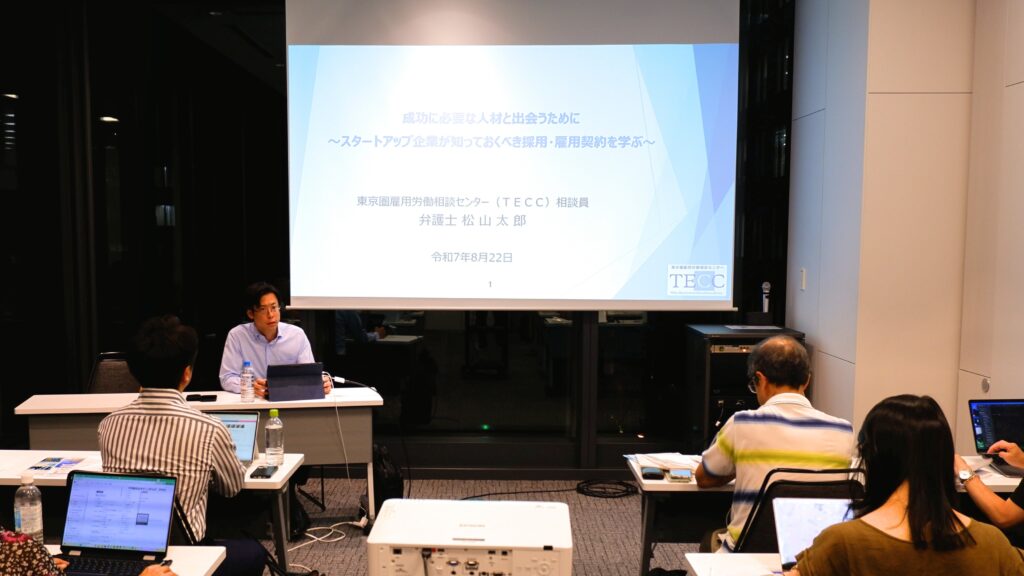 8月22日(金)、「千代田CULTURE x TECHアクセラレータープログラム2025」DAY2を開催しました。この日のテーマは「人材」です。講師に東京圏雇用労働相談センター相談員の松山太郎氏(玉川法律事務所 代表弁護士)をお招きして、『成功に必要な人材と出会うために ~スタートアップ企業が知っておくべき採用・雇用契約を学ぶ~』をテーマに、プログラムを行いました。