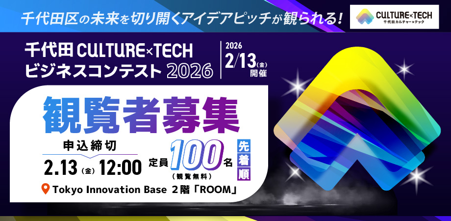 2月13日(金)に「千代田CULTURE x TECH ビジネスコンテスト2026」を開催いたします。本イベントは、千代田区内スタートアップが自身のビジネスプランをもとに外部審査委員による評価を受けることが出来るだけでなく、資金調達やネットワーク拡大のきっかけを提供することでスタートアップのさらなる成長を加速させるためのビジネスプランコンテストです。